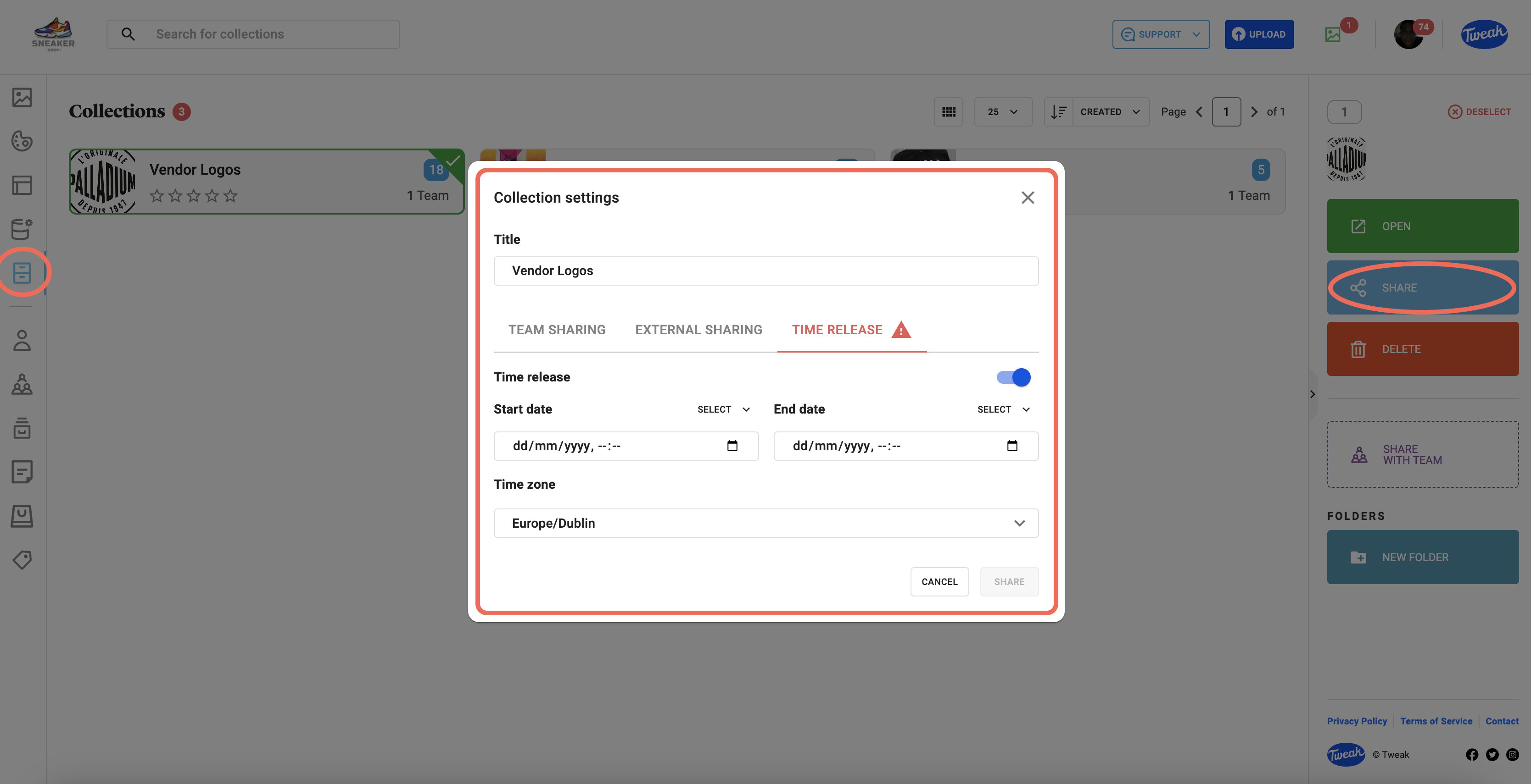 3- Click on the (share icon) on the top right and you’ll have the option to edit. Team Sharing, External Sharing & Time Release. Click on Time Release.