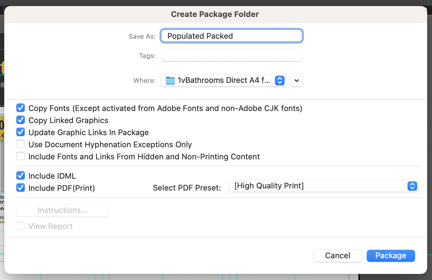 Open your InDesign document and verify that there are no missing fonts or images. Tweak supports only compressed (.zip) InDesign packaged files that include a .idml file, graphic links, and fonts. If you are using Typekit fonts, they cannot be exported and should be replaced with other fonts before packaging.