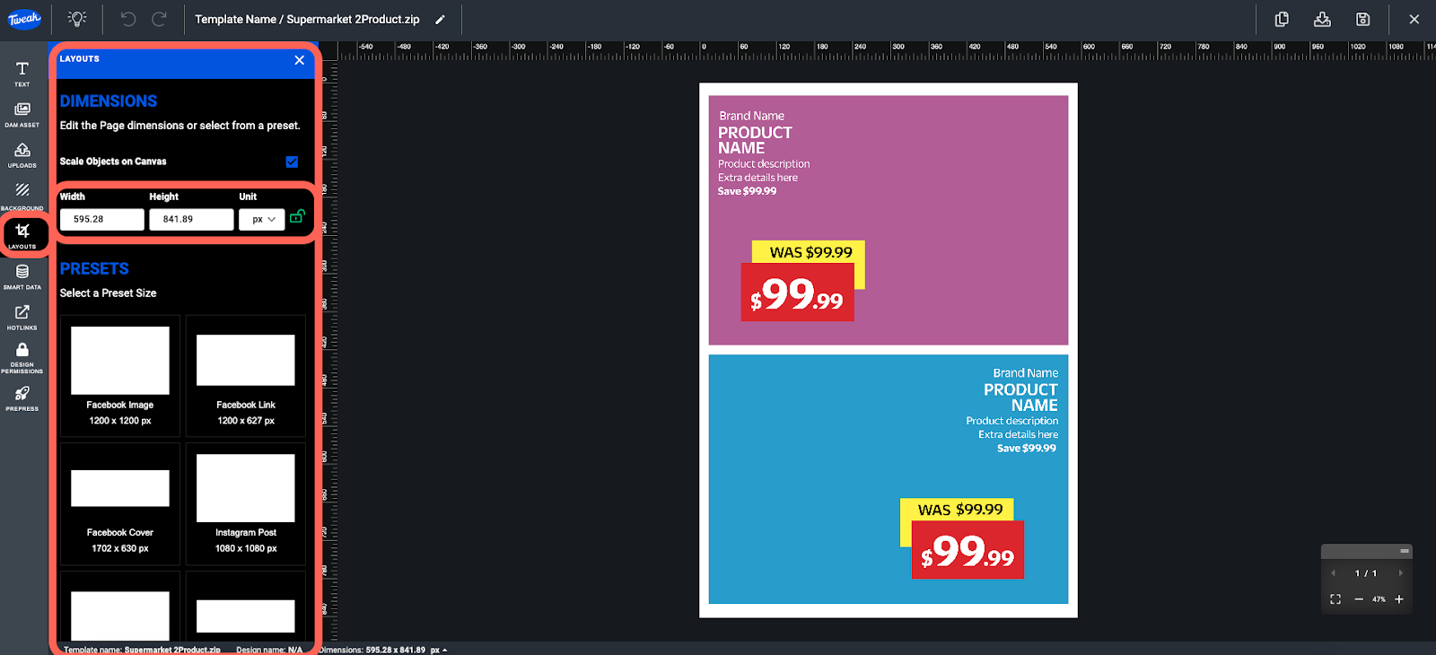 The LAYOUTS allow you to set the dimensions of your page, you can use the default settings or edit them to suit your needs. You can adjust the width, height and unit in which the dimensions are measured.